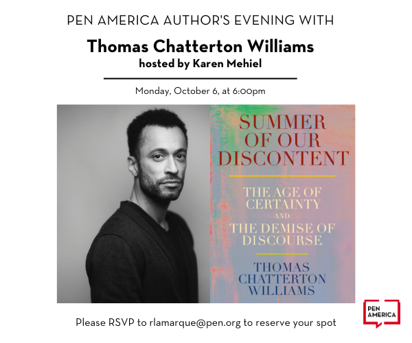Part memoir and part cultural critique, Williams reflects on the seismic events of 2020 — pandemic, protest, polarization — and how they reshaped the ways we speak, listen, and disagree. With PEN America’s mission of defending free expression as the backdrop, the evening offers a rare chance to engage directly with the author in a private residence — a setting that promises both intimacy and depth.